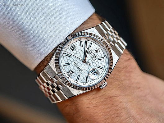 The Rolex Oyster Perpetual Land-Dweller is a symbol of refined style and mechanical precision. Featuring a striking silver honeycomb-textured dial with luminous hour markers, this watch blends sophistication with durability. Its stainless steel bracelet ensures long-lasting wear, while the fluted bezel adds a touch of classic Rolex charm. Complete with a date display at 3 o’clock, this watch is designed for individuals who demand both elegance and functionality.